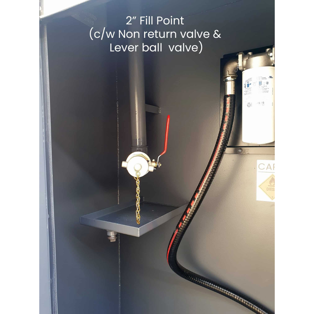 - 2″ fill point inside cabinet with lever ball valve, non-return valve & drip tray
